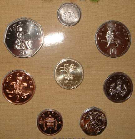1983 Mint Set (Uncirculated) £1 Royal Coat of Arms for Great Britain 1st year of issue 50p,20p,10p,5p,2p,1p,½p. In official issue foldout flat pack (Blister Pack) |