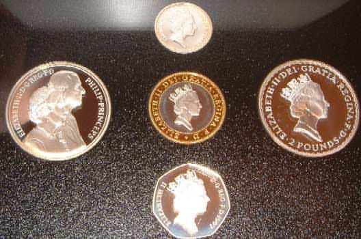 | 1997 Proof Set (Currency). £5 40th Wedding Anniversary of Queen Elizabeth II, £2 Bi-Metal,£1 Three Lions for England, Old large 50p, New smaller size 50p, 20,10,5,2 and 1 Pence coins. In blue case of issue. Very minor toning |