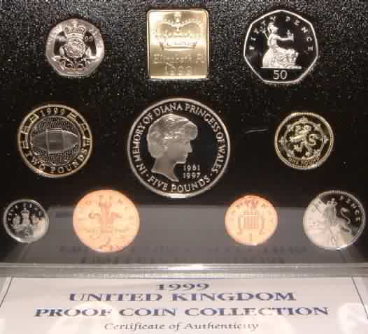 | 1999 Proof Set (Currency) £5 Princess Diana,£2 Bi-Metal Rugby World Cup Tournament,£1 Scottish Lion,50p,20p,10p,5p,2p,1p.Blue case of issue with COA |