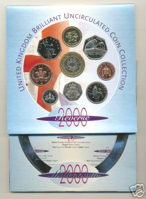 2000 Millennium Mint Set (Uncirculated) £2 Bi-Metal coin, £1 Welsh Dragon, 50p standard issue, 50p 150th Anniversary of Public Libraries, 20p,10p,5p,2p,1p. In official issue foldout flat pack (Blister Pack) |